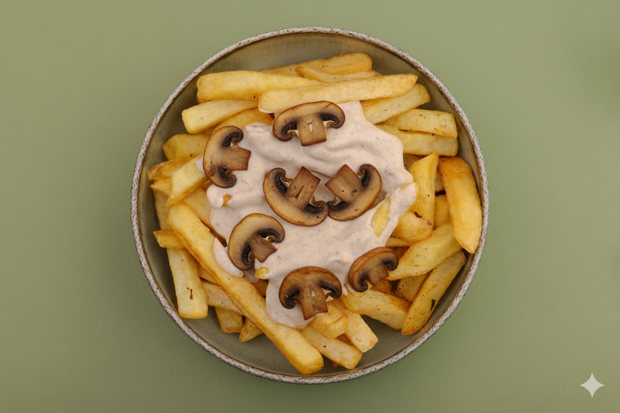 Alfredo sauce, Sliced mushrooms, Fries, ketchup