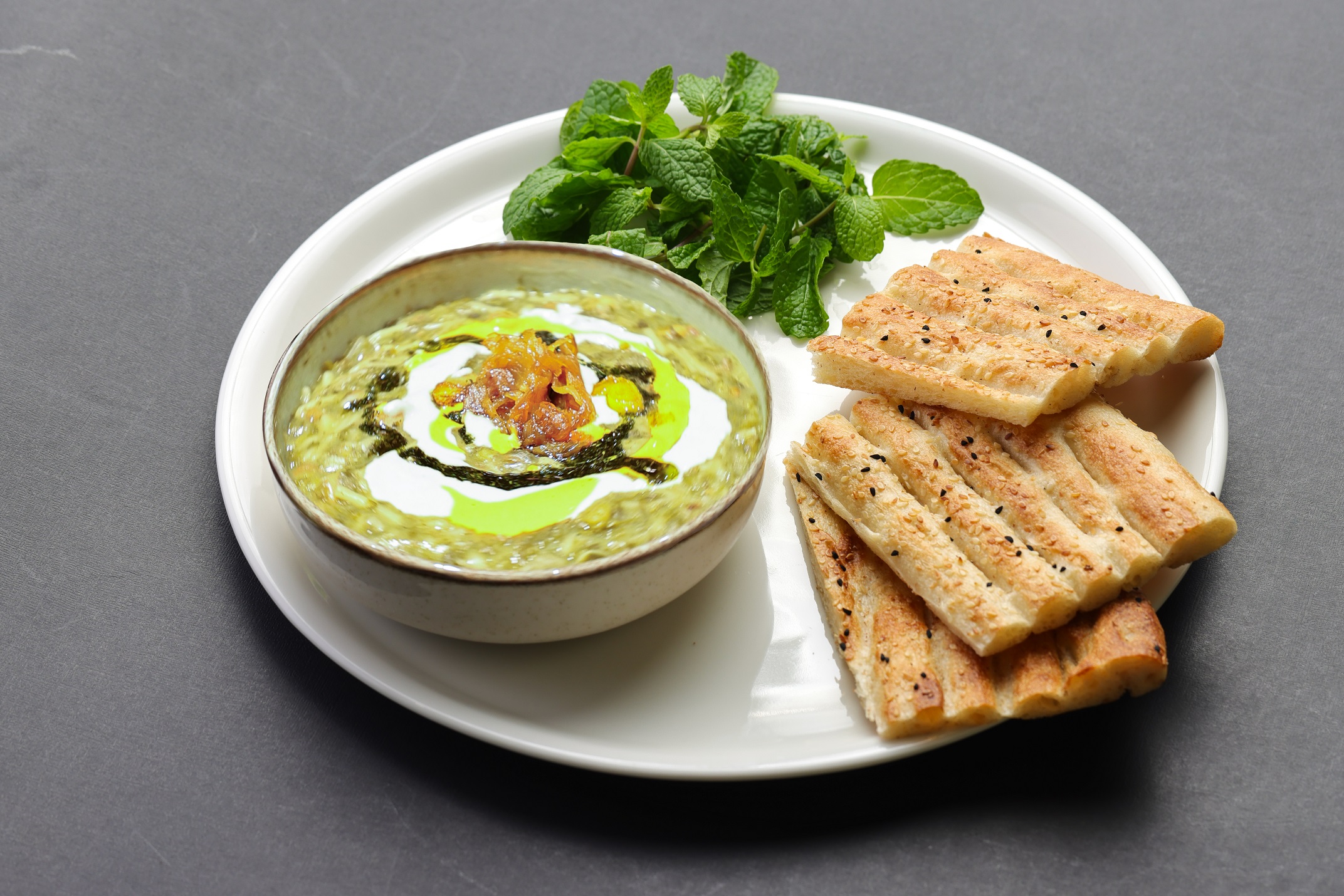 Persian noodle and herb soup topped with kashk, Fried onions, and mint.